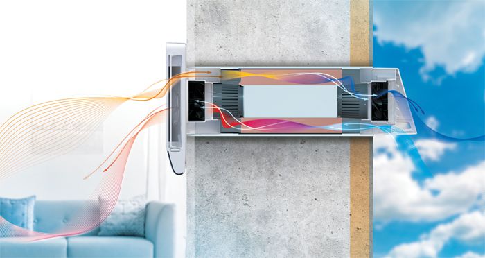 - Er is maar 1 gat in de gevel nodig voor het gelijktijdig aanvoeren en afvoeren van ventilatie lucht.