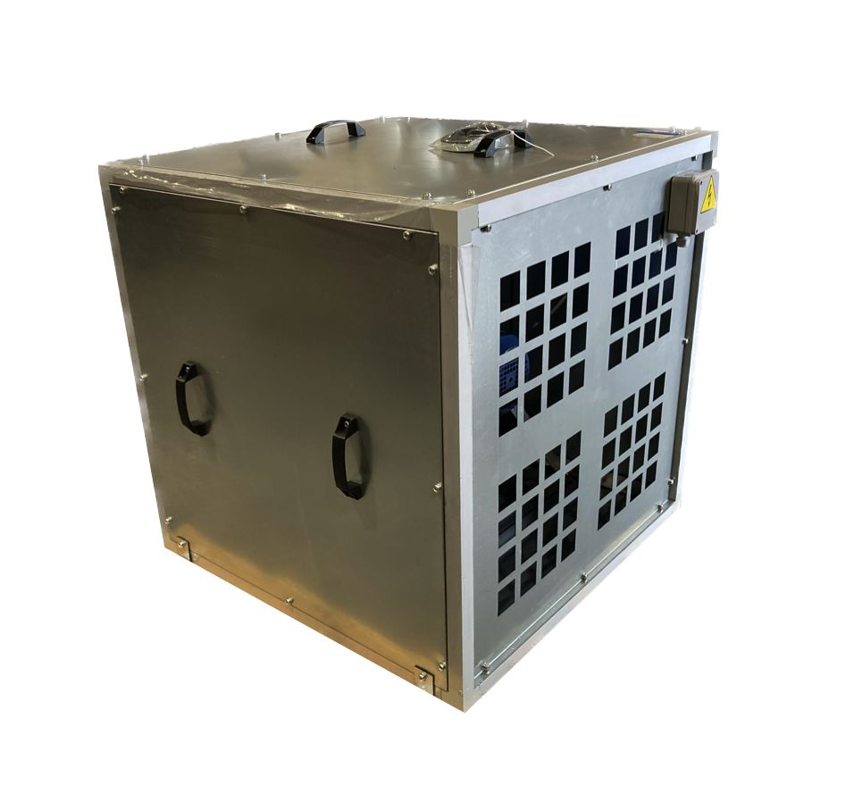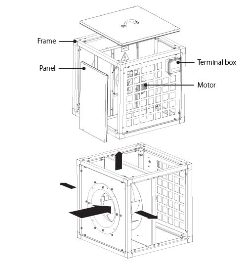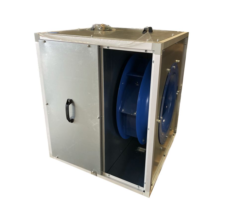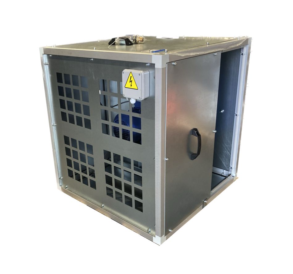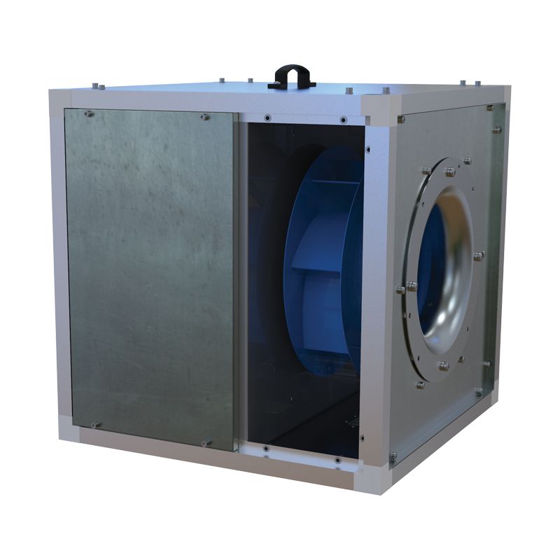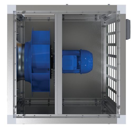 Ontwerp. Ideaal voor het afzuigen van vervuilde hete lucht tot 120 °C. De behuizing van de ventilator is gemaakt van warmte- en geluidsisolerende dubbelwandige aluzink panelen. De panelen zijn geïsoleerd met 20 mm onbrandbare minerale wol waardoor deze geluidsarm is. De elektrische aandrijving is volledig afgescheiden van de vuile luchtstroom. De luchtafvoer kan in 3 verschillende richtingen naar buiten worden afgevoerd (keuze). De ventilator en aandrijving is voor onderhoud middels een afneembaar paneel toegankelijk. Indien gewenst kan er een afvoer in de ventilator sectie worden geplaatst. Motorklasse F, IP55