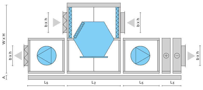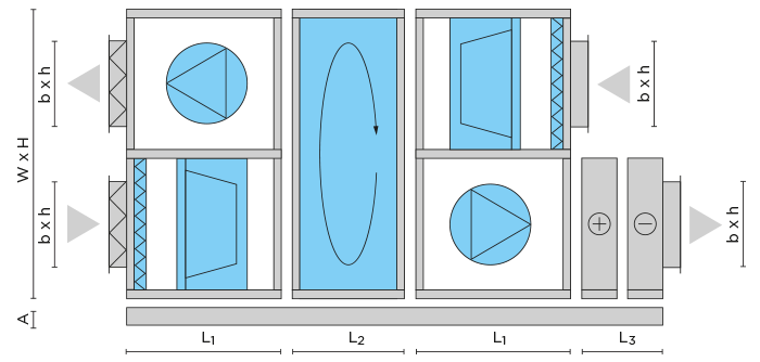 - Opgedeeld in secties voor eenvoudige installatie en transport. Optioneel kan ook een sectie met warmteterugwinning worden opgedeeld.