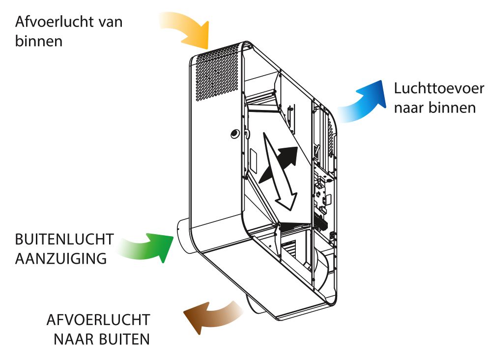 Vorstbeveiliging warmtewisselaar - De unit is voorzien van een vorstbeveiliging ter voorkoming van het invriezen van de warmtewisselaar. Bij een te lage afvoerlucht uittrede temperatuur (na de warmtewiselaar) dreigt er vorstgevaar en wordt de luchttoevoer vetilator tijdelijk uitgeschakeld. Als de luchtafvoer temperatuur is gestegen wordt de luchttoevoer weer ingeschakeld.